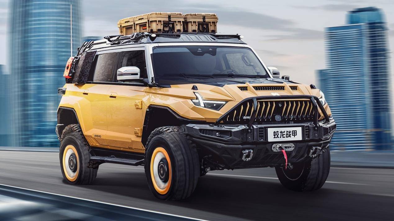 猛士917蛟龍戰甲采用昂貴的航空級鍛造碳纖維材料,在前后金屬保杠、前機蓋、車頂拓展平臺等多處使用,讓車身更輕、強度更高。