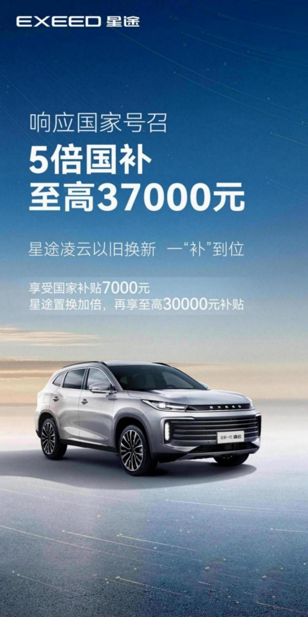 星途汽車也第一時間積極響應國家以舊換新號召,開展“價到底 換到位”全系鉅惠活動,即日起至2024年12月31日期間,消費者報廢國三及以下排放標準燃油乘用車或2018年4月30日前注冊登記的新能源乘用車,并選購星途全系車輛,可享最高補貼37000元;