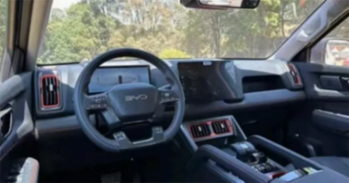 要說(shuō)區(qū)別最大的地方還是內(nèi)飾,傳統(tǒng)皮卡多是布滿了實(shí)體按鍵,但SHARK不一樣,該車中控區(qū)與豹5的布局較為相似,只是副駕位置并沒(méi)提供娛樂(lè)屏。除此之外,全液晶儀表盤、懸浮式中控屏、豹式家族擋桿等設(shè)計(jì)元素完全承襲了新能源化的設(shè)計(jì)風(fēng)格。此外,比亞迪也為SHARK提供了一些實(shí)體按鍵,而且都放在了換擋機(jī)構(gòu)的周邊,整體布局和按鍵樣式與豹5非常相似。