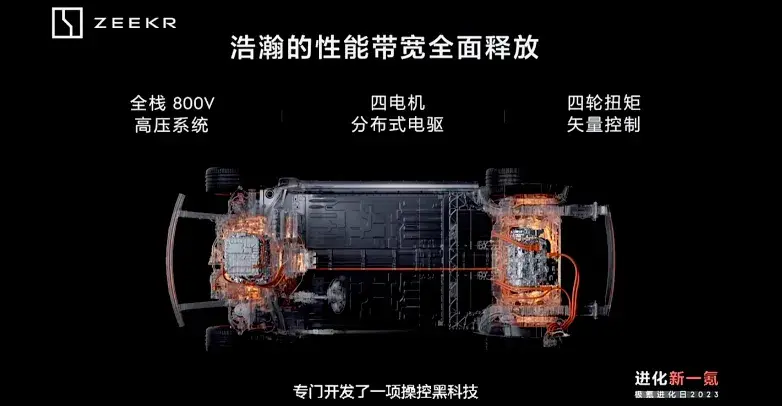 全系800V架構這個估計是基本操作了,不需過多解析。電驅系統方面,其實可以參考新款極氪001,后驅版車型或會搭載310kW的碳化硅電機,這是源自001FR的技術,足以使其成為功率最高的兩驅純電動車;四驅版車型則在此基礎上搭載一個270kW的前軸電機,至少有著580kW的綜合功率。