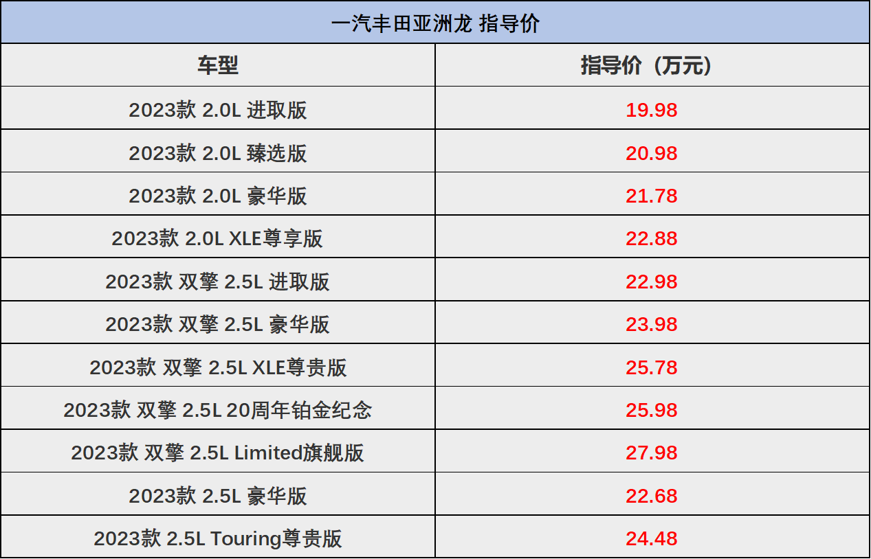 作為一款和雷克薩斯ES同源的車型,亞洲龍在合資中型車市場一度是很火熱的車型,有著“雷克薩斯ES平替”的稱號,但事實是,亞洲龍在前幾年價格也并不便宜,高配車型落地都奔著30萬去了,所以這款車型給人的形象都是比較高端的,檔次感上要比廣汽豐田的凱美瑞高半級。但如今,亞洲龍似乎也扛不住了。