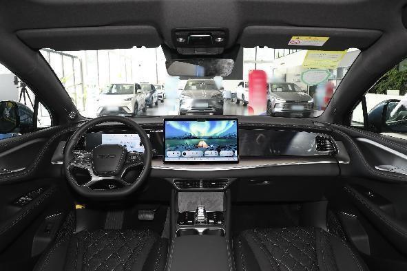 內飾方面,整體造型較為簡潔,中控臺上有一塊很大的黑色飾板,并采用10.25英寸的全液晶儀表和可旋轉的15.6英寸中控屏,一些地方還采用了軟包材料和縫線處理,整個內飾設計雖然談不上什么創新,但都是我們很熟悉的元素,倒也挑不出太多毛病,算是中規中矩吧。
