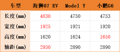 尺寸方面,該車的長寬高分別是4830/1925/1620mm,軸距是2930mm。與Model Y和小鵬G6相比,海獅07 EV除了高度沒有優勢外,其他的數據均優于另外兩臺車。