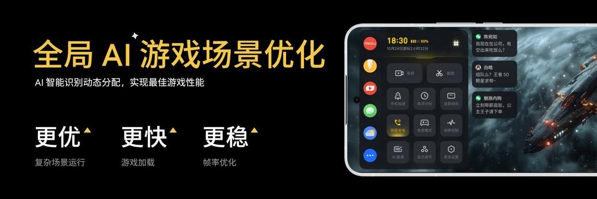Flyme 全新游戲模式也正式加入 AI 賦能行列,支持全局 AI 游戲場景優化,將優化游戲助手視覺動效及交互布局,應用小窗菜單調整至左側邊欄,右側劃分快捷控制區域,更簡潔、更好用。