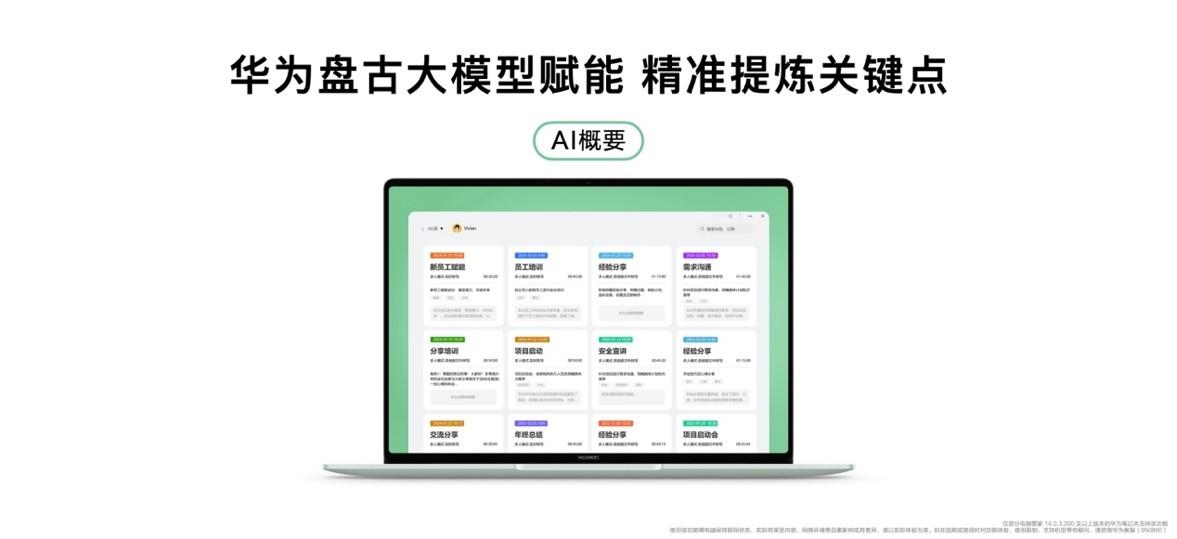 在華為盤(pán)古大模型賦能下,新款華為MateBook 14不僅支持了此前旗艦機(jī)上的AI紀(jì)要功能,而且也支持新增的AI概要功能。AI概要可以幫助用戶(hù)快速地從大量的音、視頻信息中提取出關(guān)鍵信息,提煉核心內(nèi)容,歸納總結(jié)更高效。