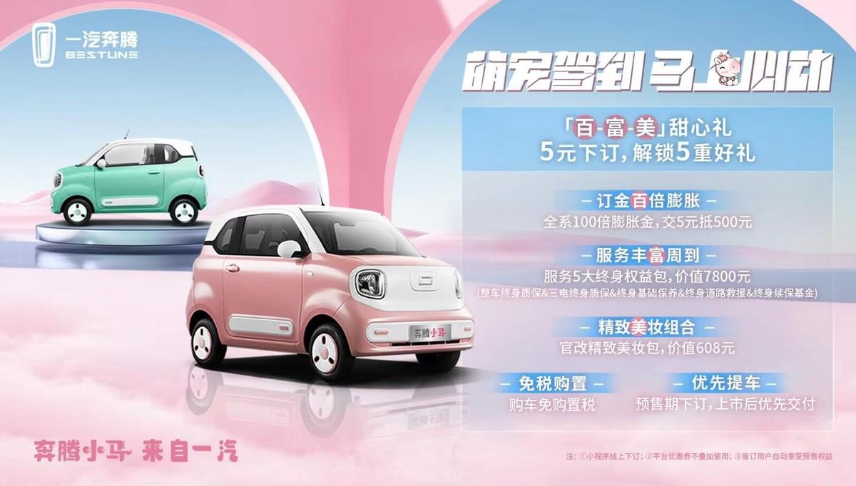 不難看出,奔騰小馬是一款品質(zhì)優(yōu)秀、配置越級的城市通勤代步神器,2.89萬元的預(yù)售起步價更凸顯了極致性價比。眼下新車已經(jīng)全面開啟預(yù)售,全系享受100倍膨脹金,5元即可抵500元;同時還能享受豐富的官方服務(wù),整車終身質(zhì)保、三電終身質(zhì)保、終身基礎(chǔ)保養(yǎng)、終身道路救援、終身續(xù)保基金,統(tǒng)統(tǒng)安排!如果大家近期想要入手一款mini身材的通勤小車,相信奔騰小馬一定是你的不二之選。