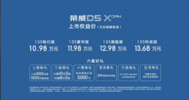 榮威D5X DMH正式上市,新車共推出4款車型,權益售價10.98萬起