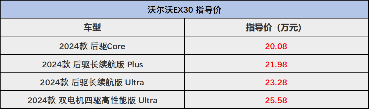 5月19日,沃爾沃旗下全新純電SUV-沃爾沃EX30正式公布了售價,全系共有4款車型,指導價區間為20.08萬至25.58萬。除了公布價格之外,針對6月30日前購車的用戶,如果是沃爾沃車主置換或者增購,可以享受1.2萬的官方補貼,異品車型則可以享受5000元補貼。