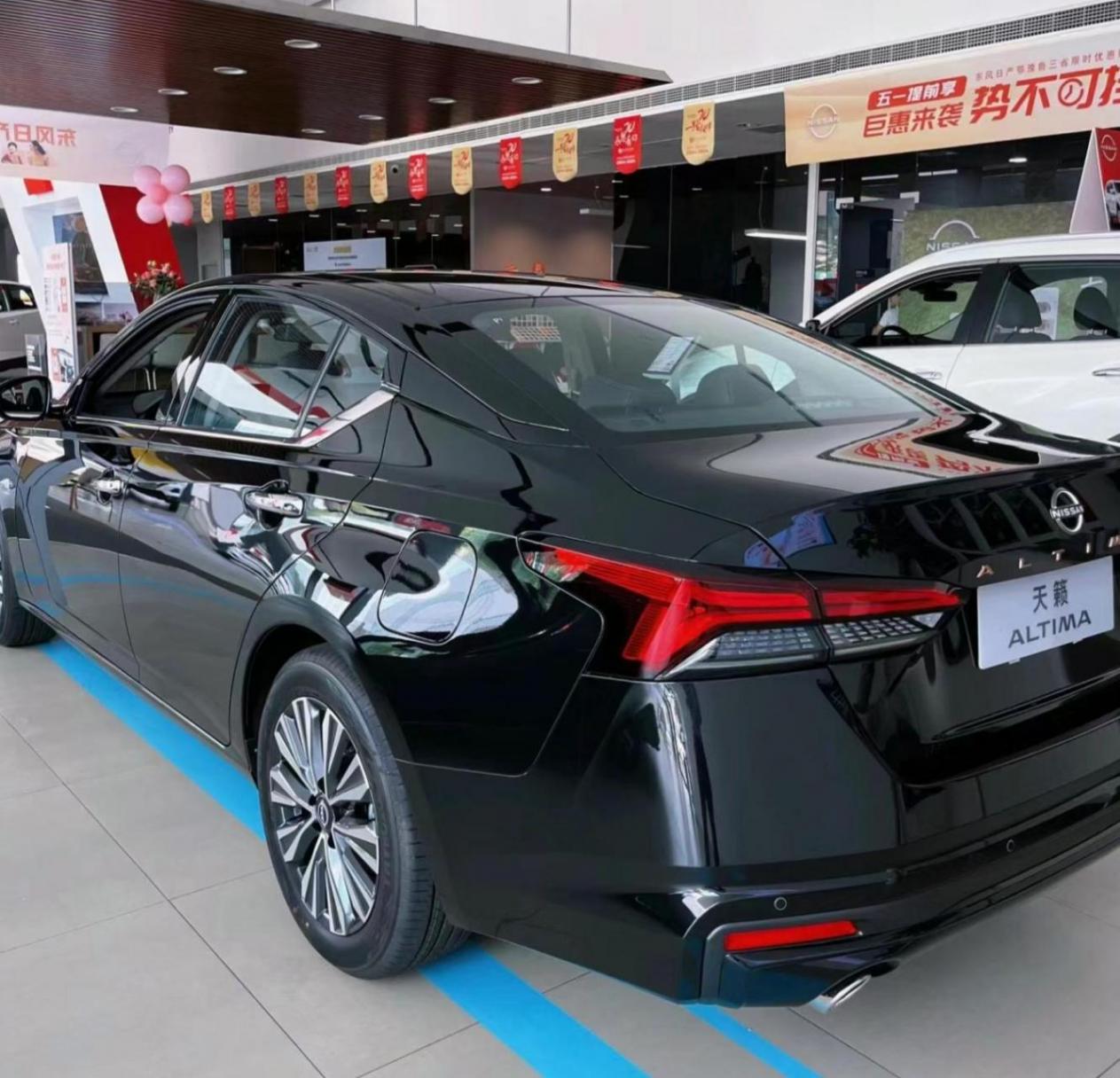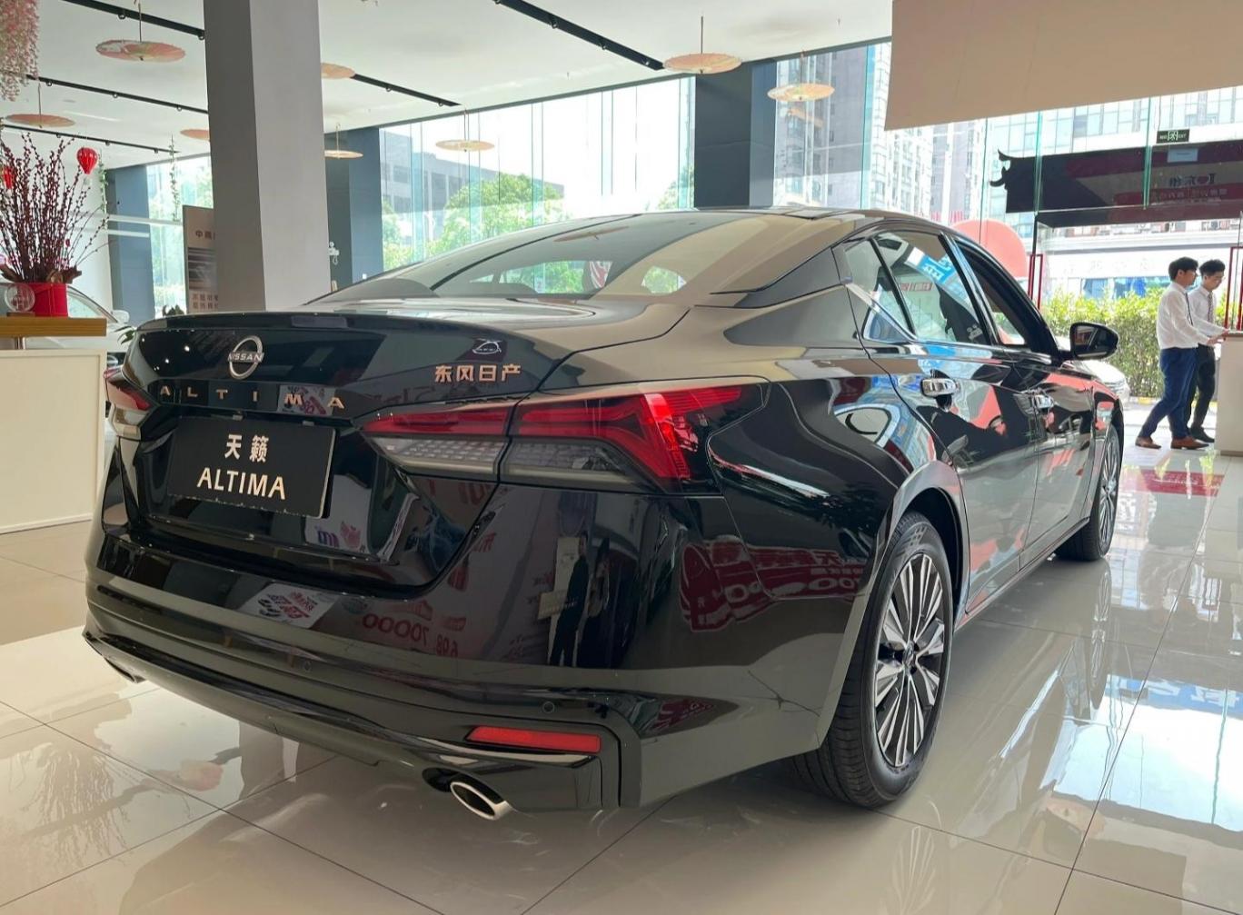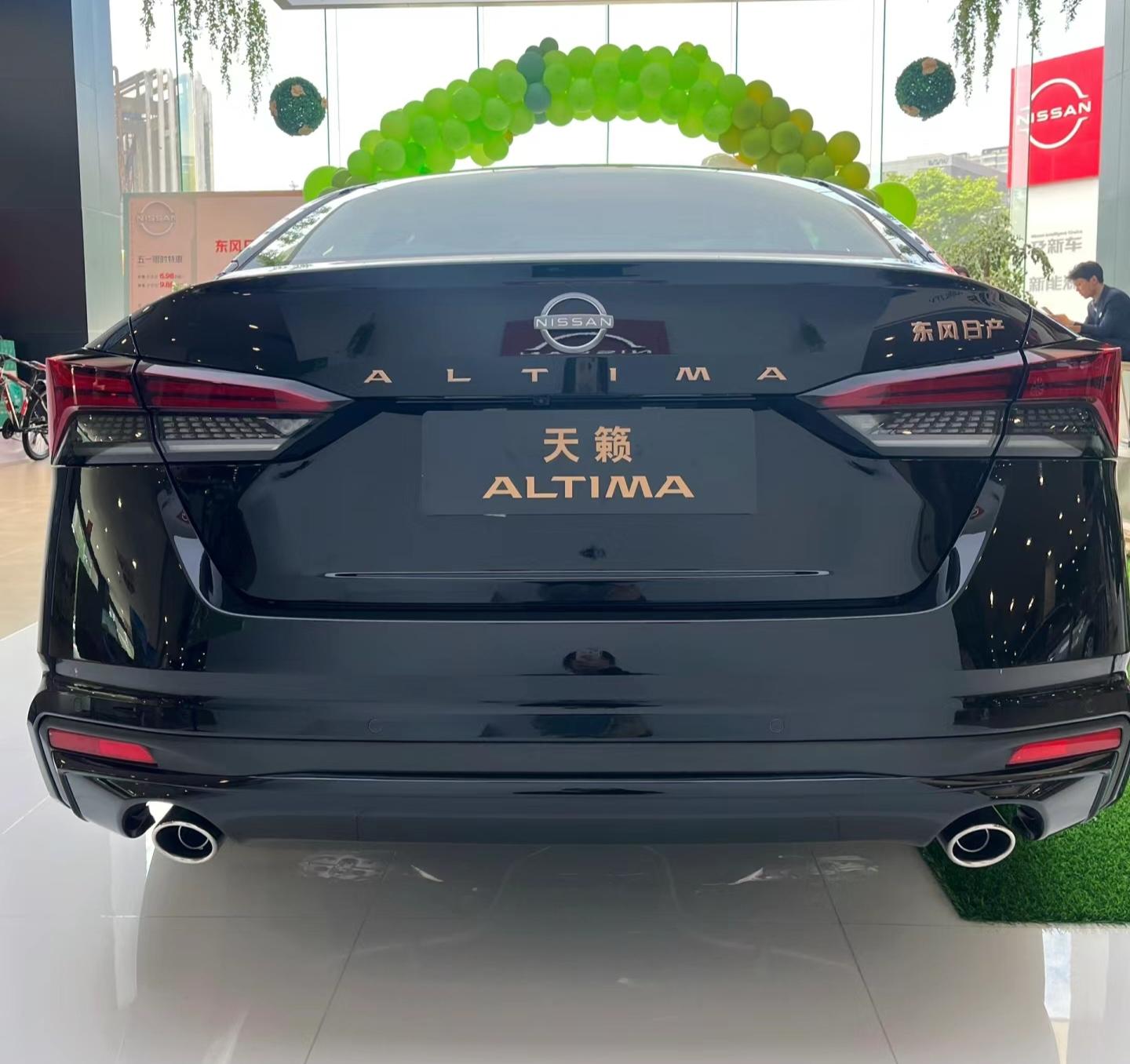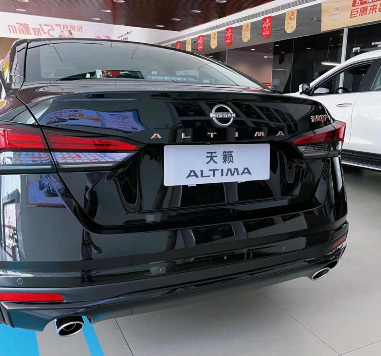在車身側面,新車同樣一黑到底,除了車門把手的鍍鉻條和車窗下沿的鍍鉻條之外,通體全部是黑色,配合流暢的車頂過渡,特殊的C柱交匯等元素,有著更強的立體感。當然大尺寸的輪轂采用的多幅造型,提升了運動的屬性。在車尾部分,T字形的紅色光源包裹白色燈組的尾燈,不會有明顯的變化,中央的天籟字母車標變為了金色,右上角的東風日產也是金色,與車頭形成對應,尾箱蓋末端不忘翹起的小尾翼,后保險杠部分則有著雙邊雙出排氣,顯示了燃油車型應有的姿態,即便該車只是一款2.0升自然吸氣動力。