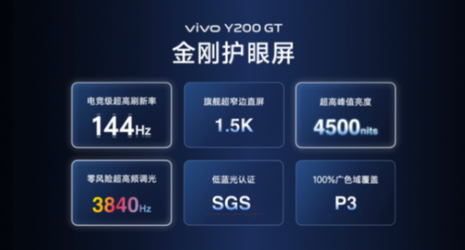 屏幕方面,vivo Y200 GT采用一塊旗艦級的金剛護眼屏,擁有比肩旗艦級別的4500nits超高峰值亮度,以及3840Hz零風險超高頻調光,還有行業第一梯隊的 144Hz電競級超高刷新率,實現顯示、流暢和護眼等方面的全面越級。
