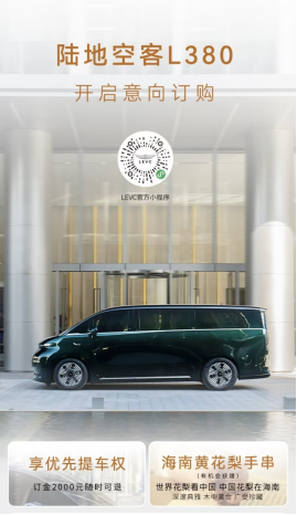LEVC(即翼真汽車)旗下首款豪華純電MPV產品——“陸地空客L380正式開啟驚喜預訂。首批預訂用戶僅需支付2,000元意向訂金,即可享受優先提車權益,且訂金隨時可退。此外,翼真汽車還聯合吉利旗下海南黃花梨山莊為首批訂購用戶精心準備了獨具稀缺性、傳承性與增值價值的“木中黃金”——海南黃花梨手串作為奢享伴手禮。