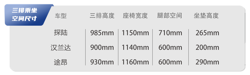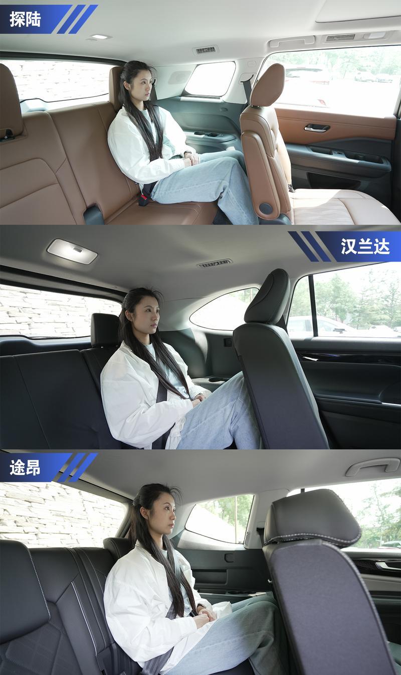 第三排的頭部空間方面,探陸在保證了足夠的坐墊高度后空間依舊充足。或許是途昂的空間優(yōu)化水平不太出色,第三排的豎向空間高度相對來說不算優(yōu)秀,即使它有著更方正的車身造型,但頭部空間所剩不算大。漢蘭達的第三排頭部空間則看齊途昂,不過由于較為傾斜的D柱造型,頭部空間余量不多,不太適合高個子的乘客。
