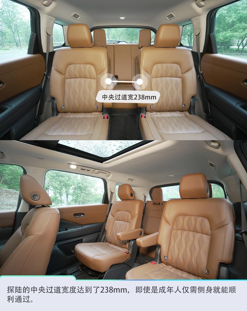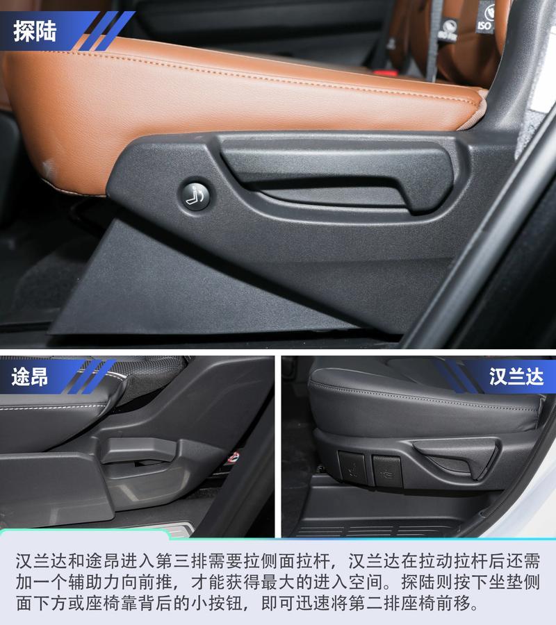 探陸的中央過道做到了同級最寬,并且探陸的第二排地臺能夠做到純平,進出體驗更好,漢蘭達和途昂的第二排中央地臺有一定凸起,不過不算太高。