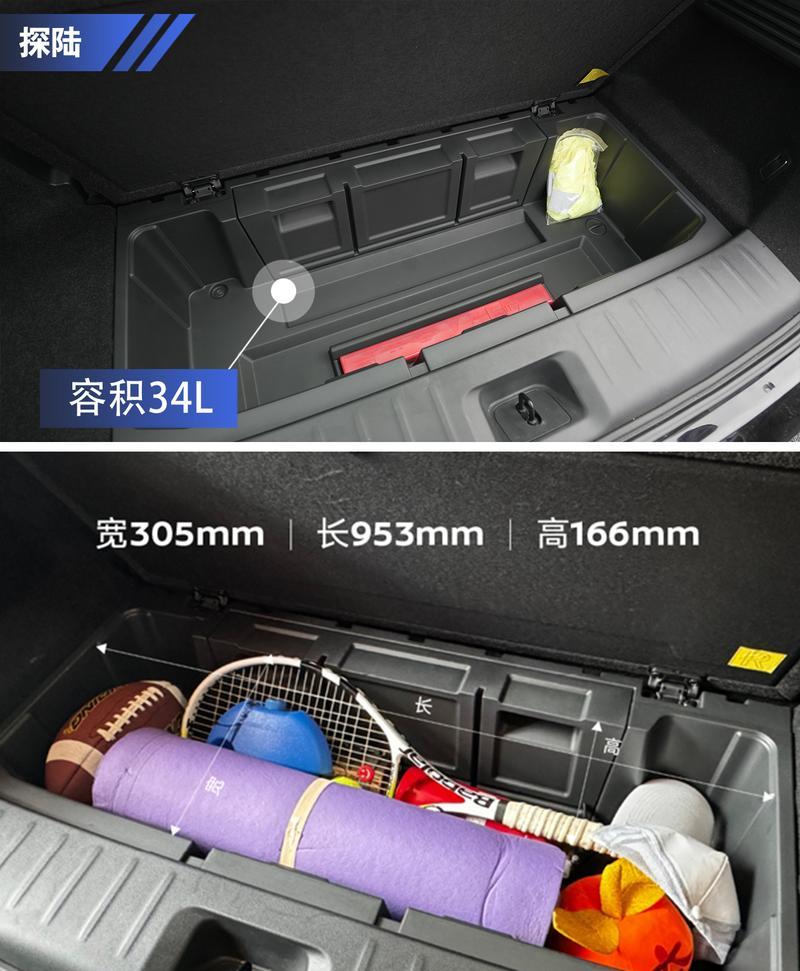 掀起地臺的蓋板,探陸還能提供一個尺寸不小的下沉隱藏儲物格,比較令人驚喜。就算是全家人一起出門,放置行李的空間也很充足。探陸的下沉式隱藏儲物格容積達到34L,放些小包、運動器械、拍攝裝備和開車時常備的鞋都挺合適。