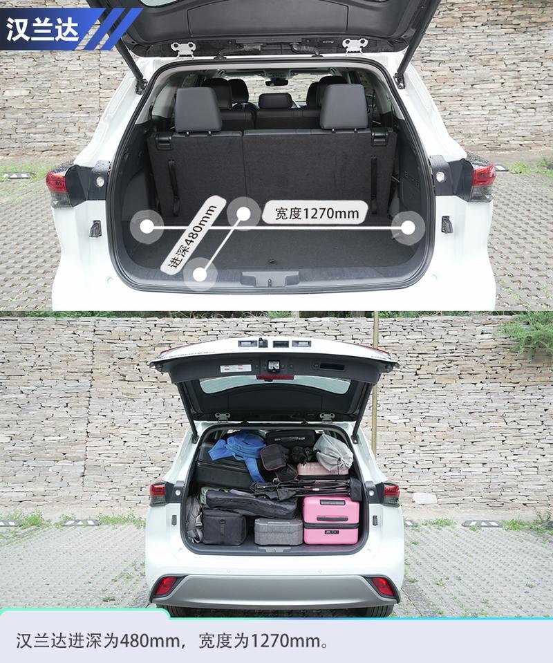 作為尺寸最小的一位,豐田漢蘭達把第三排座椅立起來后,進深與探陸表現(xiàn)相近。同時地臺較低,搬取大件物品能夠較為省力,后備廂空間寬度也能看齊探陸,放包沒有什么問題,但放多個登機箱就有些吃緊。此次裝入我們攜帶的所有行李壓力還是挺大的,由于車身造型,較為傾斜的C柱一定程度影響了豎向空間,所以需把第三排的座椅靠背調(diào)得更加陡直,犧牲三排的乘坐感受。