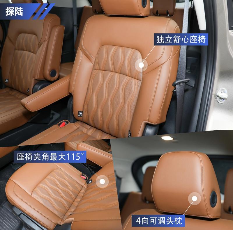 從座椅的乘坐體驗來說,探陸的第二排配備了獨立舒心座椅,人體工程學(xué)上找不出太多毛病,雖然沒有那么花哨豪華的功能,但坐姿、座椅的高度、對身體的承托,都比較合適。探陸的座椅能夠提供10檔調(diào)節(jié),作為家庭使用,家中各種身材的成員坐上去都能夠調(diào)節(jié)到適宜的坐姿。此外,后排座椅靠背的夾角最大能夠達到115°的黃金角度,長途時的坐姿可以調(diào)節(jié)得更加半躺,并且頭枕還能進行4向調(diào)節(jié),能夠更好地把頭部托住。