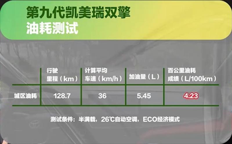 此時我們再對車輛進行加油,至跳槍后總共加油5.45L,最后計算得出第9代凱美瑞的城區油耗為4.23L/100km,幾乎與WLTC綜合油耗持平。