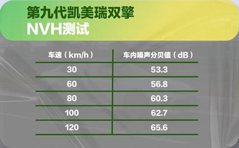 在噪音測試中,第9代凱美瑞在30km/h時速下噪音為53.3dB,60km/h時速下噪音為56.8dB。