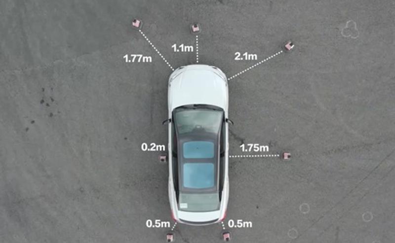 在盲區檢測方面,我們也進行了實地測試,如圖所示,我們在1-7號位置各放置了一個0.6m高的樁筒,這些位置都是日常我們用車過程中常見的盲點。樁桶到車身的直線距離:①距A柱左前1.77m、②距正前方1.1m、③距A柱右前2.1m、④距B柱右側1.75m、⑤距右側車尾0.5m、⑥距左側車尾0.5m、⑦距B柱左側0.2m。