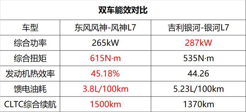 相比之下,銀河L7采用的是吉利全新一代雷神電混8848系統(tǒng)。其中1.5T混動專用發(fā)動機最大功率120kW,峰值扭矩255N·m,發(fā)動機熱效率為44.26%。與發(fā)動機匹配的是一臺前置的永磁同步電機,電機功率107kW,扭矩338N·m,整套混動系統(tǒng)的綜合扭矩達到535N·m。百公里虧電油耗僅5.23L;CLTC綜合續(xù)航里程1370km。