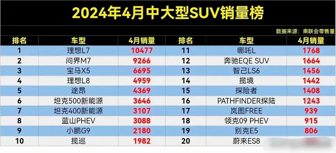 風水輪流轉,車市競爭激烈,排行榜又發生了大變化,問界M7銷量大跳水,冠軍不保,理想L7實現反超,登頂榜首,小鵬G9再次發力,重返前十名。根據乘聯會發布的2024年4月中大型SUV銷量榜來看,銷量超過4千輛的只有5款,理想L7奪得冠軍,問界M7獲得亞軍,寶馬X5排在第三名,理想L8和途昂都進入前五名,坦克500新能源、坦克400新能源、藍山PHEV、小鵬G9、攬巡都進入榜單前十名。太慘了!4月中大型SUV銷量榜,問界M7丟冠,理想L8第4,小鵬G9第9