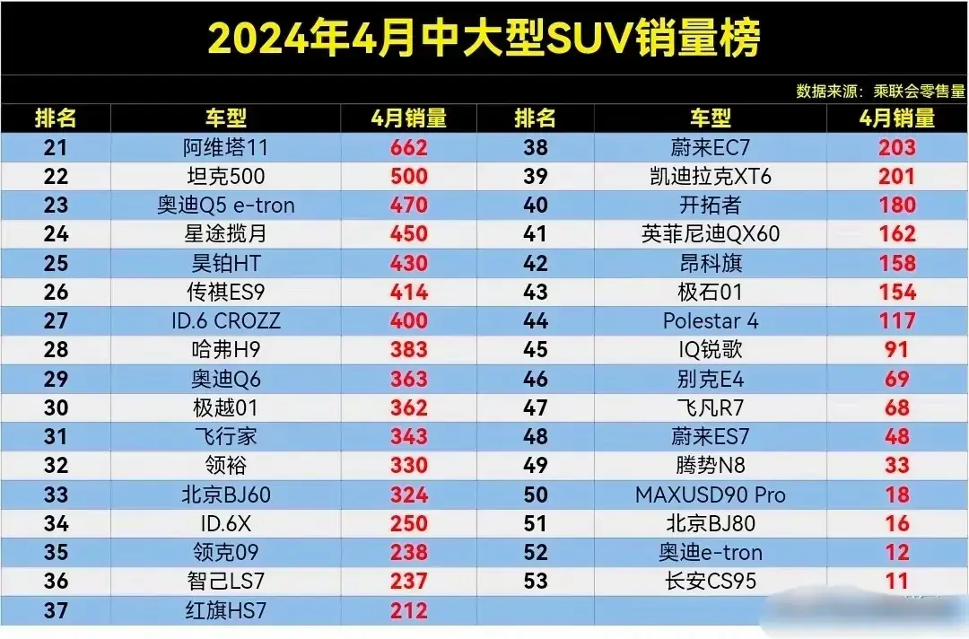 嵐圖FREE、領克09PHEV、別克E5、蔚來ES8、阿維塔11、坦克500、都在500輛以上。奧迪Q5 e-tron、星途攬月、昊鉑HT、傳祺ES9、ID.6CROZZ、哈弗H9、奧迪Q6、極越01、飛行家、北京BJ60、領裕、ID.6X、領克09、智己LS7、紅旗HS7、開拓者、凱迪拉克XT6、蔚來EC7、極石01、昂科旗、英菲尼迪QX60都在100~400多輛左右,表現很一般。