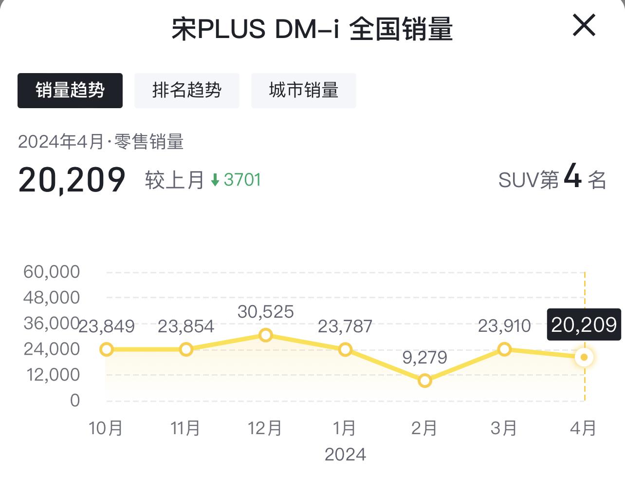 第4名,比亞迪宋PLUS DM-i,月銷20209輛,新一代的國民SUV,榮耀版推出后更是大殺四方。