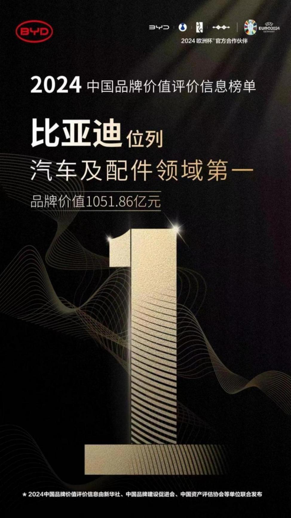 僅僅二十年時間,比亞迪不僅以300萬輛的成績走進全球車企銷量排行榜前十的位置,同時還在“2024中國價值評價信息”中以1051.86億元的品牌價值,位列汽車及配件領(lǐng)域第一。