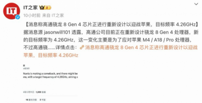 據(jù)IT之家此前報道:“高通公司目前正在重新設(shè)計驍龍 8 Gen 4 處理器,新的目標頻率為 4.26GHz,這一變化主要是為了應(yīng)對蘋果 M4 / A18 / Pro 處理器。”