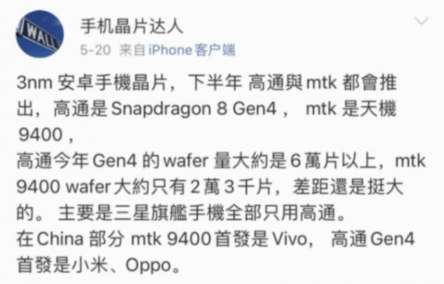 據(jù)博主@手機晶片達人 發(fā)文透露,OPPO、小米將首批搭載驍龍8 Gen4。