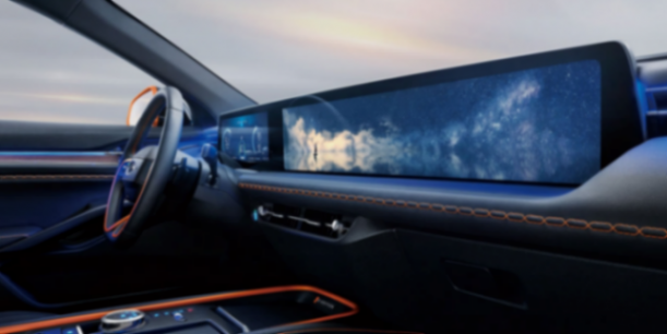 內飾方面,EVOS采用了極簡設計,中控面板基本看不到任何物理按鍵,寬度超過1.1米的巨幅屏幕一直延伸到副駕位置,并由12.3英寸液晶儀表及27英寸4K高清中控屏所組成。