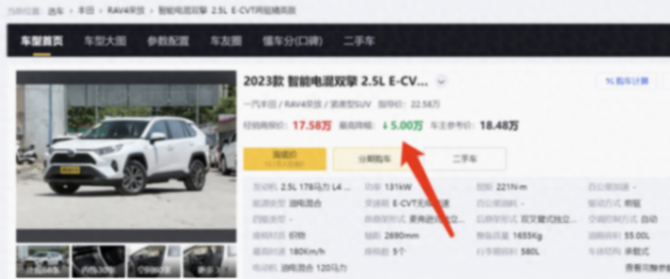 許多人會將緊湊型SUV作為家用,因為緊湊型SUV擁有足夠大的空間和良好的通過性,能適應多種使用場景。此外,緊湊型SUV還具有良好的經濟性,養護壓力也不大。如果車友想買緊湊型SUV,對配置和油耗一定要求,在眾多車型里,不妨看看這款一汽豐田RAV4榮放,提供2.0升自然吸氣發動機和2.5升油電混合動力系統可選,全系標配Toyota Safety Sense輔助駕駛,WLTC綜合油耗低至5.1L/100km,廠商指導價17.68-26.38萬,據河北滄州地區終端顯示降幅5萬元,4月份售價12664輛。接下來以RAV4榮放 2023款 智能電混雙擎 2.5L E-CVT兩驅精英版(優惠后17.58萬)為例,來聊下該車的產品力表現。