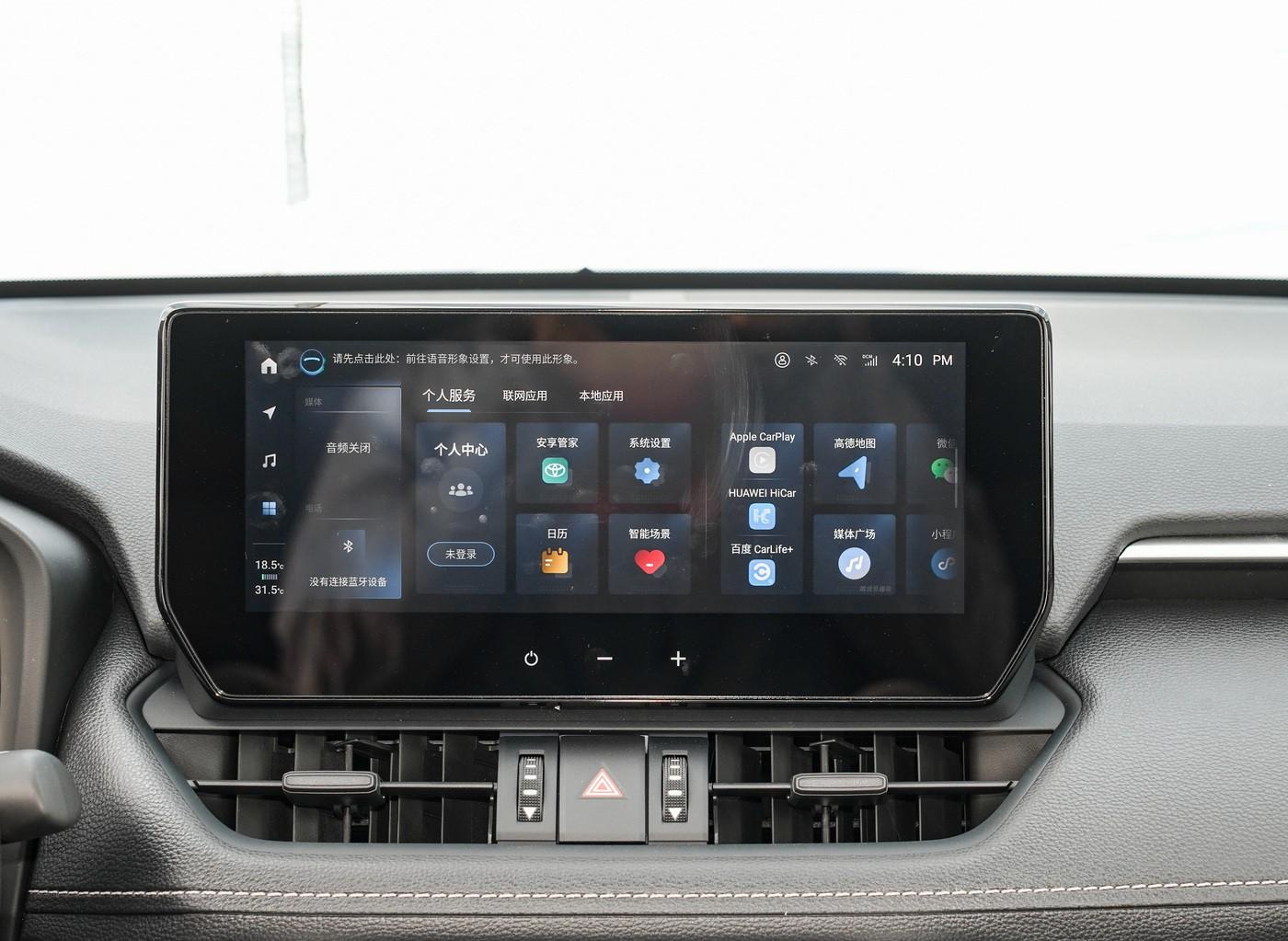 內飾方面,沿襲著豐田的務實設計風格,中控臺簡潔、層次感鮮明,在副駕駛前方還設計了一個長條儲物槽,內部帶有防滑處理,這點非常不錯。配備12.3英寸全液晶儀表盤,顯示效果、信息豐富程度都較為優異;10.25英寸懸浮式中控屏搭載豐田智行互聯車載智能系統,集成有音樂、微信、小程序、離線地圖數據的高德地圖等應用,即使在信號不佳的偏遠山區,也能精準導航,并配備CarPlay、CarLife、Hicar手機互聯映射等,比較到位。