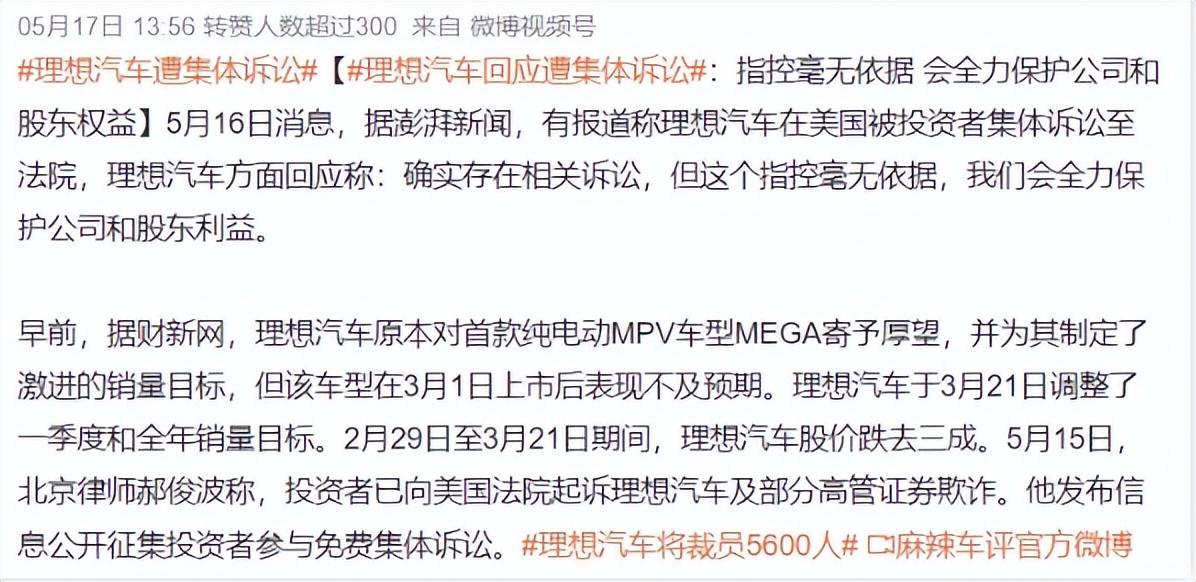 從3月1日MEGA上市至今,理想汽車美股和港股均雙雙大幅下跌,截至5月21日,理想的美股和港股市場均出現了“腰斬”。短期之內,公司業績的大起大落,成為美股投資者集體訴訟的導火索。美國某律所在該文件公布后便對理想汽車的證券指控展開了調查。理想對此回應稱,官方已確認該指控并無依據,并會全力保護公司和股東利益。