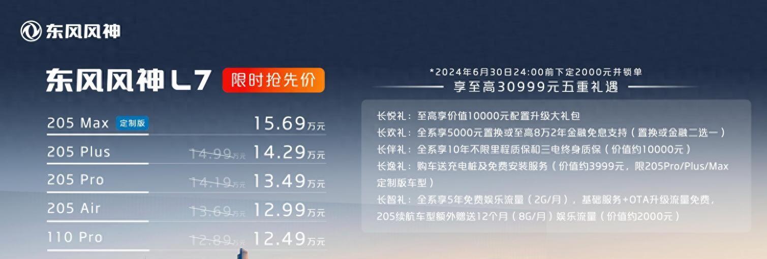 這款新車CLTC工況下純電續航里程分為兩種,一種純電續航里程達到110公里,一種純電續航里程達到205km。很多人沒想到的是,東風風神將風神L7 2024款 205 Air版本的限時搶先價定為12.99萬。