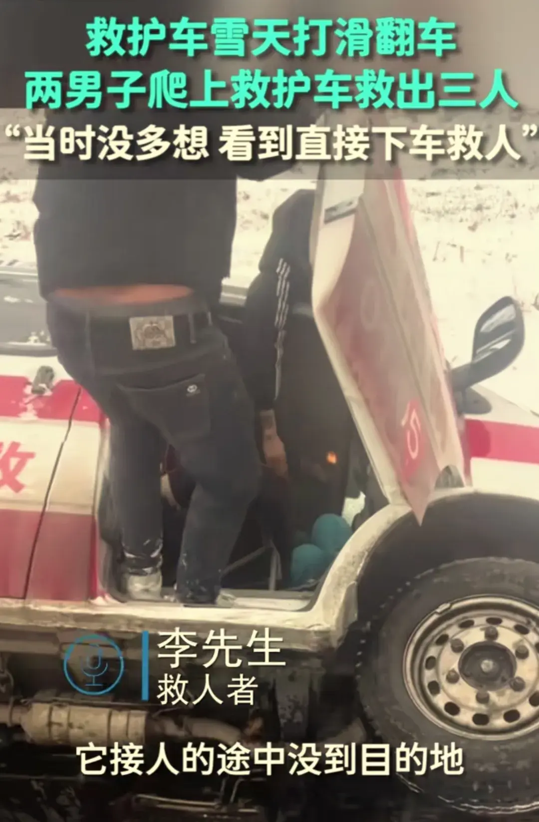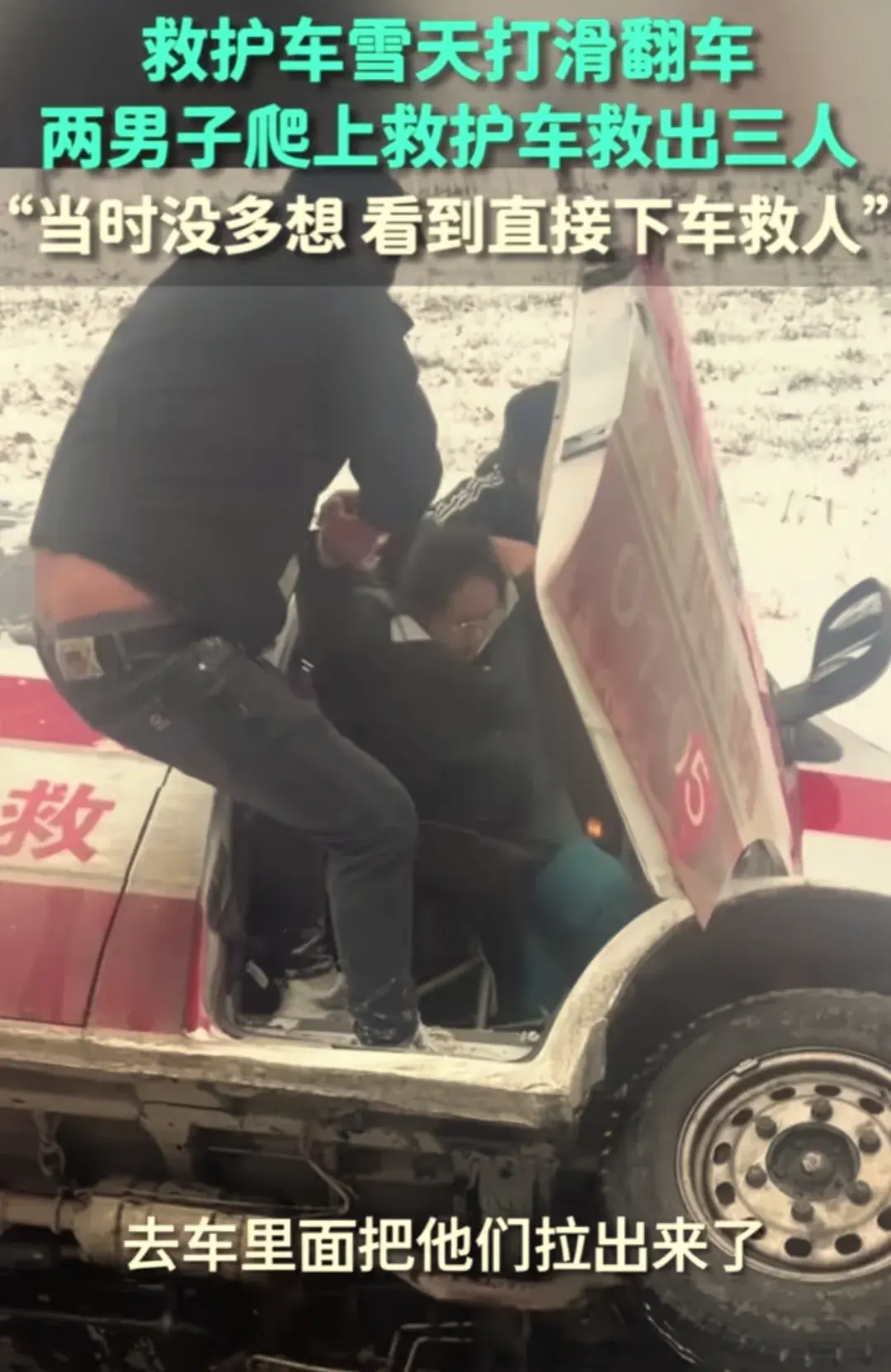 由于大雪天路打滑,一救護車在去接人的路途中翻車了,這時兩熱心男子出現了,這兩個男子當即爬上救護車救出了被困在車里面的三個人:兩個女的和一個開車的司機。