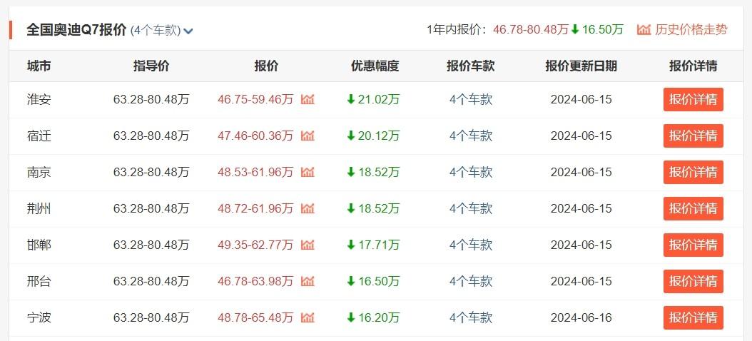 奧迪Q7作為一款純進口的豪華中大型SUV,廠商售價是63.28-80.48萬元,放在以前,那也絕對是能夠與奔馳GLE、寶馬X5等德系競品所齊名的車型。不過,由于現(xiàn)款奧迪Q7已多年未換代,所以它在終端優(yōu)惠方面也著實是大的驚人。
