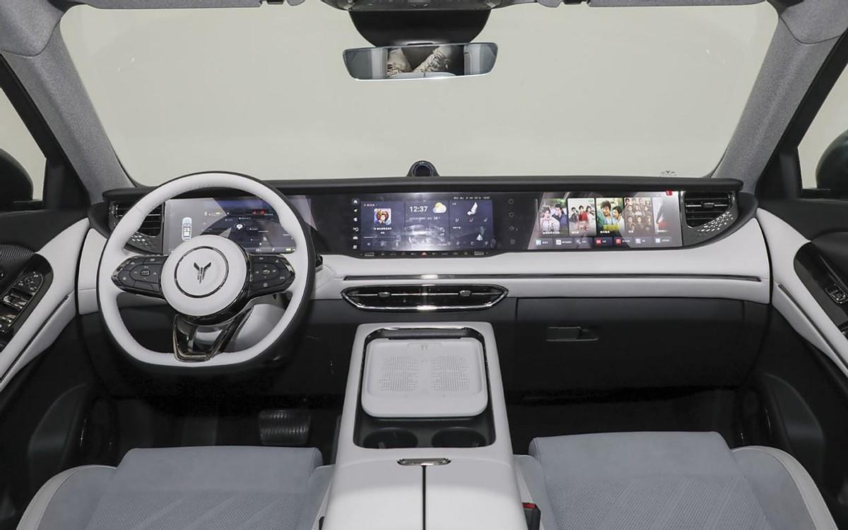 內飾是目前新勢力車型流行的做法, 配備了一塊全液晶儀表屏、一塊大尺寸的懸浮式中控屏以及后排的吸頂屏,而屏幕里也內置了許多的功能和軟件。另外,在高配車型上還配備了冰箱,如此一來,冰箱、彩電、大沙發就都有了,不知這是否能打動你呢?