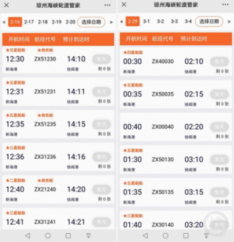 16日,上游新聞記者在“瓊州海峽輪渡管家”查詢發現,實時數據顯示,海口新海港至徐聞港的新能源車輪渡票,2月16日至3月1日的票均已售完,3月2日僅剩1張,3月3日之后的票暫無法購買。