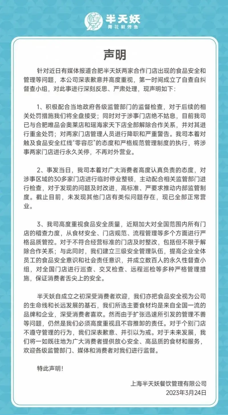 為了解決這些問題,半天妖烤魚品牌決定采取一系列措施。首先,他們加強了對門店的管理和監督,確保每一家門店都能夠按照標準操作流程進行經營。同時,他們還加強了對食品安全的監管力度,確保每一份菜品都能夠達到安全標準。此外,他們還積極改善員工的工作環境和待遇,保障員工的合法權益。