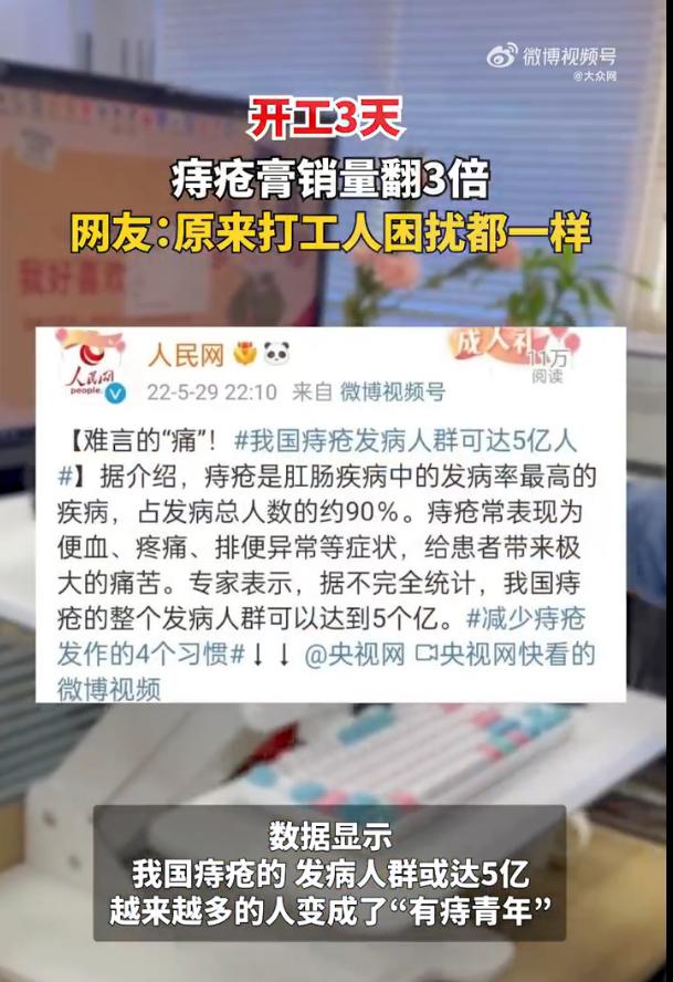 2月20日,節后開工第3天,大家陸續進入工作狀態,改造工位環境的同時,春節期間的飲食習慣,不規律的作息,導致很多人痔瘡發作,痔瘡膏已然成為工位“新貴”。數據顯示,我國痔瘡的發病人群或達5億,越來越多的人變成了“有痔青年”。在某電商平臺活動中,開工3天痔瘡膏銷量翻3倍,網友直呼:原來打工人的困擾都一樣。