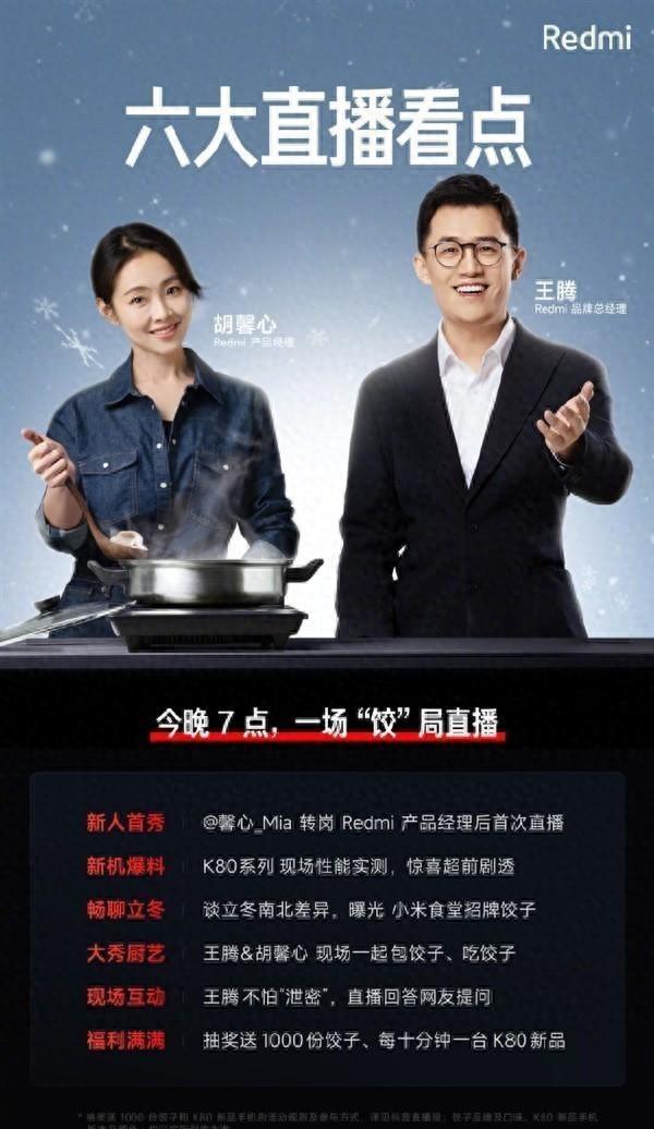 今晚七點,Redmi直播間要搞大事啦!聽說咱們Redmi的掌門人王騰要攜新晉產品經理胡馨心小姐姐一起直播?沒錯,你沒聽錯!這可是胡馨心小姐姐榮升產品經理后的首次亮相,想想還有點小激動呢!據說直播內容精彩紛呈,除了常規的嘮嗑環節,還會現場揭秘小米食堂的“鎮店之寶”——餃子!這餃子到底有多好吃,能讓王騰總和胡馨心小姐姐親自上陣,包餃子、吃餃子,想想都流口水!是不是隔著屏幕都能聞到香味了?