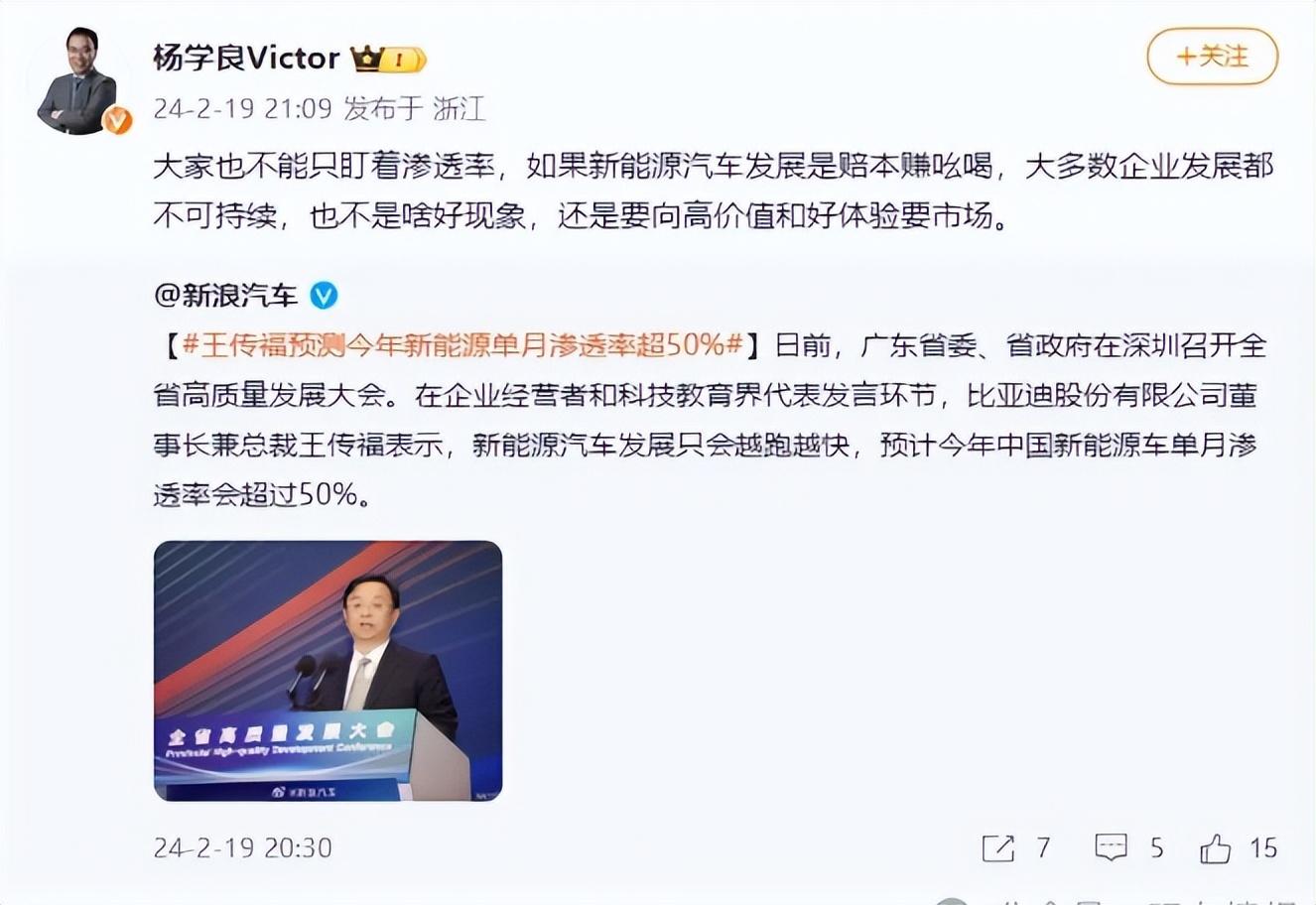 沒過幾天,吉利汽車的高管楊學(xué)良轉(zhuǎn)發(fā)該微博并且寫了如下評(píng)論:“大家也不能只盯著滲透率,如果新能源汽車發(fā)展是賠本賺吆喝,大多數(shù)企業(yè)發(fā)展都不可持續(xù),也不是啥好現(xiàn)象,還是要向高價(jià)值和好體驗(yàn)要市場(chǎng)。”