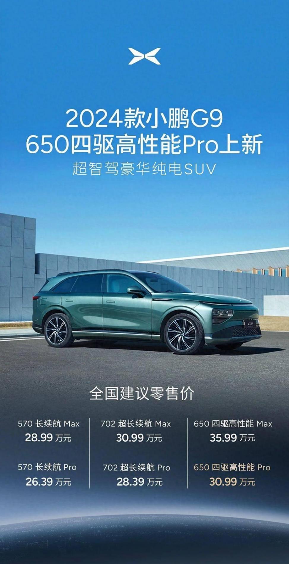 近日,小鵬G9上新了一款新車,它就是650 四驅(qū)高性能Pro版,該版本的售價(jià)為30.99萬(wàn)元。需要注意的是,小鵬G9的售價(jià)區(qū)間為26.39-35.99萬(wàn)元,目前有2萬(wàn)元限時(shí)補(bǔ)貼,補(bǔ)貼后的售價(jià)區(qū)間為24.39-33.99萬(wàn)元。本次上市的新車,剛好是次頂配的價(jià)格。那么問題來(lái)了,新車到底值不值得買呢?索性今天就來(lái)和大家聊一下。