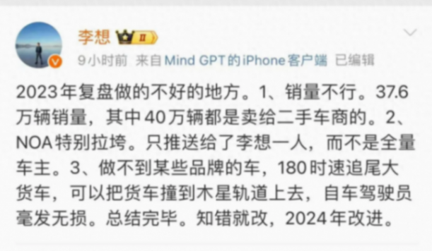 在新能源汽車行業(yè)風(fēng)起云涌的當(dāng)下,理想汽車CEO李想的每一條微博都備受關(guān)注。最近,他的一條微博再次引發(fā)了廣泛討論:“2023年復(fù)盤做得不好的地方。1、銷量不行。37.6萬輛銷量,其中40萬輛都是賣給二手車商的。”此言一出,輿論嘩然,難道新勢力銷量第一的理想汽車真的“銷量不行”嗎?