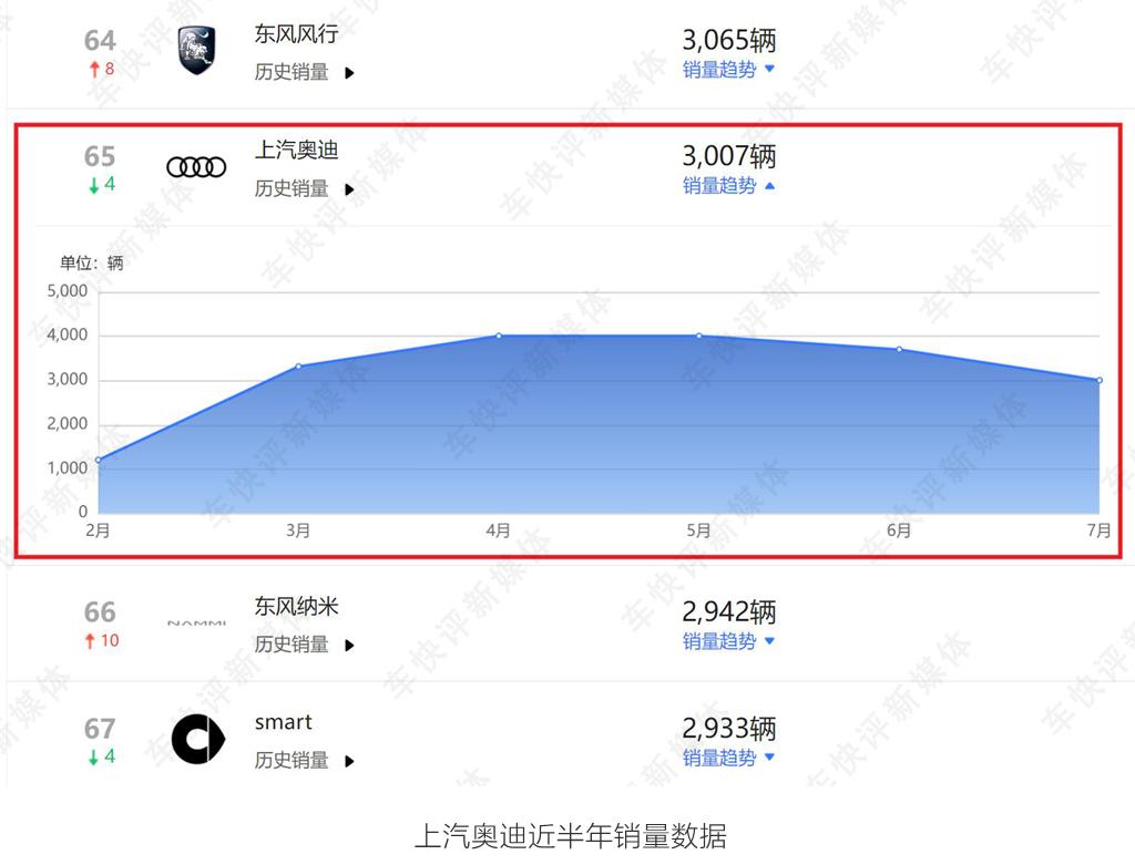其次就是銷(xiāo)量了,上汽奧迪在售的三款車(chē)型中,除了奧迪A7L月銷(xiāo)量能夠上千臺(tái),其余兩款車(chē)型奧迪Q6和Q5 e tron這兩款車(chē)自上市以來(lái),月銷(xiāo)量始終都沒(méi)有突破千輛。