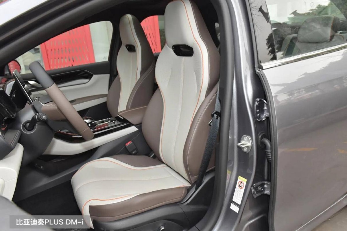 秦PLUS在中控設計上采用了對稱式布局,烤漆裝飾面板連接了出風口,也包含了帶電子檔把的換擋機構,而除了8.8+12.8英寸雙懸浮屏之外,它還有環繞布局在擋把兩側的物理按鍵,配合大面積撞色軟包,還有金屬與烤漆的混搭,配合仿皮覆蓋的運動風格座椅,車輛的質感是提得上去的。