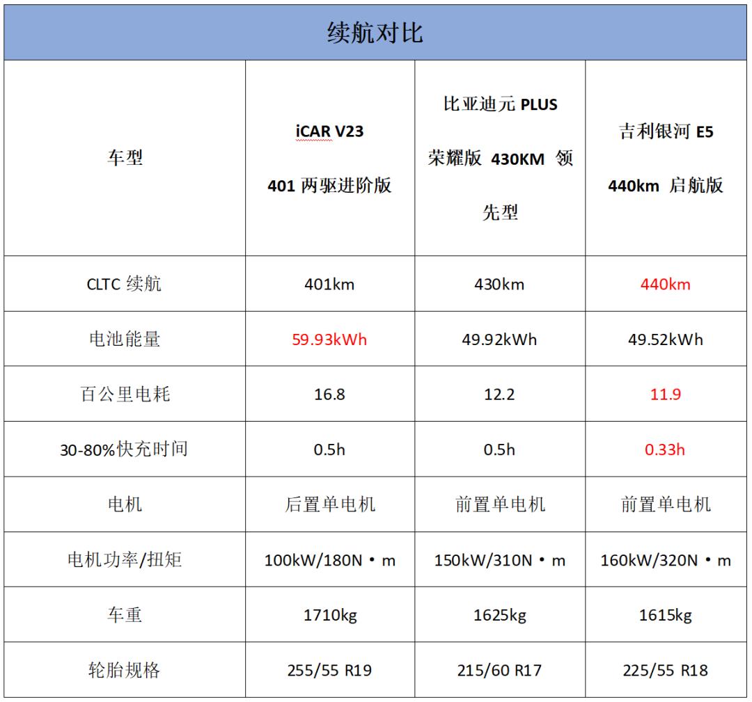 三車都是單電機,而電機功率和扭矩是銀河E5的最強,iCAR V23的單電機輸出較弱,如果要來個地板電加速比賽的話,肯定是最后撞線的。另外銀河E5車重最輕、電耗也最低,所以其CLTC續航最長,而iCAR V23雖然有最大的電池包,比兩個對手多出了10度電,但車重、輪胎方面都吃虧,所以電耗肯定是更高的,整體續航會遜色一些。
