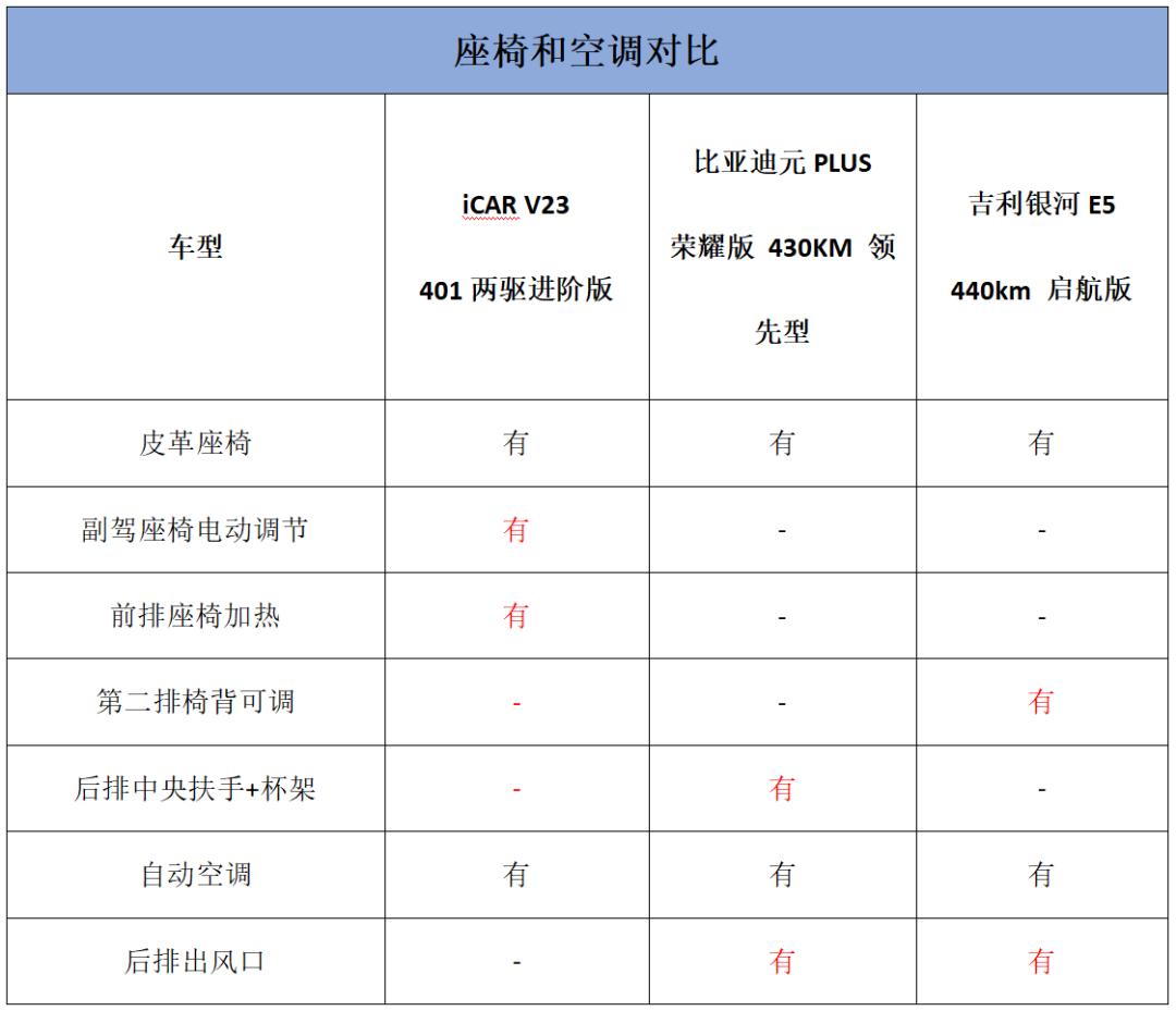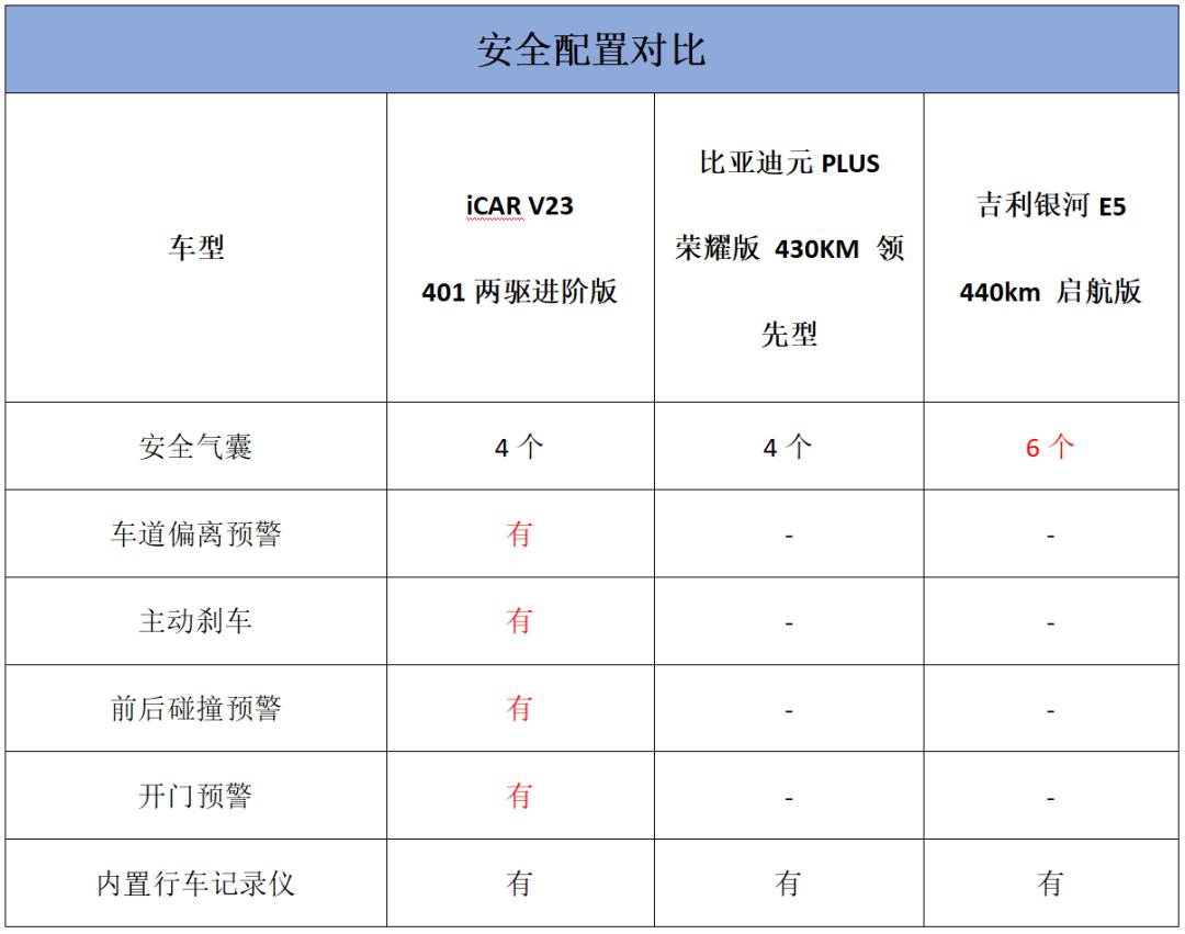 在安全配置方面,三車其實本身沒有太大差別,就是銀河E5多出了側氣簾,在被動安全上更勝一籌。但是就在18日,iCAR官方為V23推出了“0元換購科技舒適包”,這個原本需花1萬元的選裝包就包含了一些安全配置,所以一下子就讓V23在這方面表現更好,更安全的車誰都想要吧。
