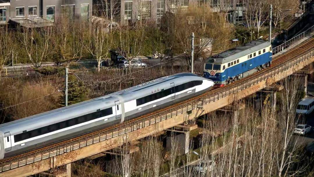 近日,CR450-AF-001在中車青島四方股份公司總裝下線,由內燃機車牽引轉運至北京中國鐵道科學研究院環形線路進行試驗和測試。
